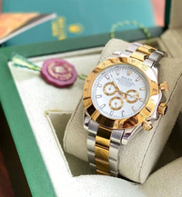 Designed with a 40mm case and a bold gold-and-silver stainless steel bracelet, the Daytona 16523 captures both luxury and functionality. The elegant white dial is accented by three gold sub-dials and luminous hands, framed by a polished gold tachymeter bezel for added style and chronograph utility.