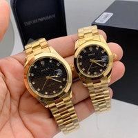 Add a touch of regal elegance to your relationship with the Rolex Black Dial Golden Chain Couple Watch Set. Featuring a bold black patterned dial adorned with shimmering crystal hour markers, this luxurious duo is paired with a full gold-tone stainless steel bracelet for a truly majestic look.